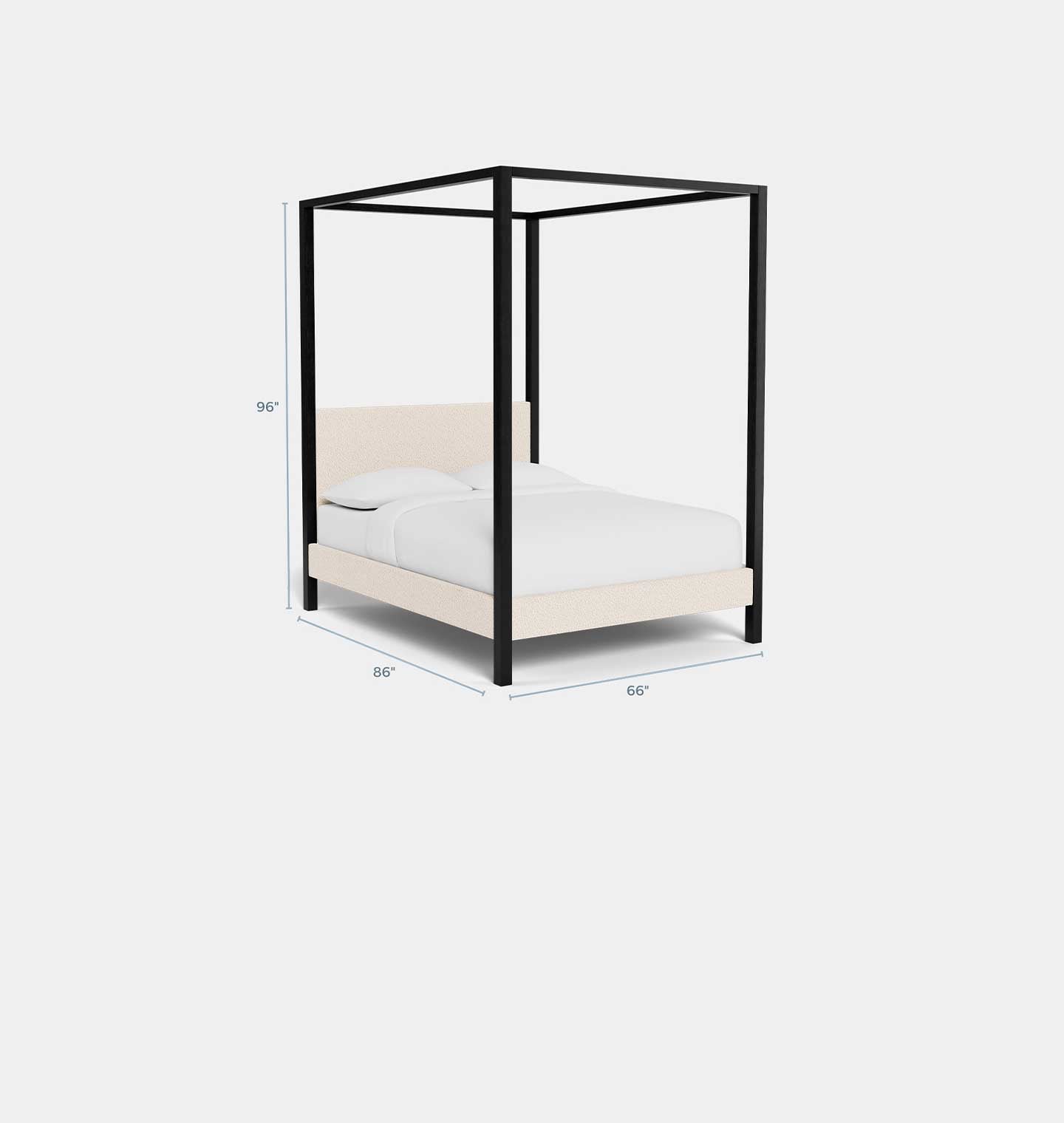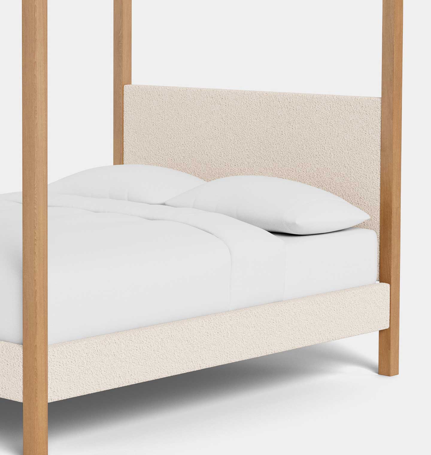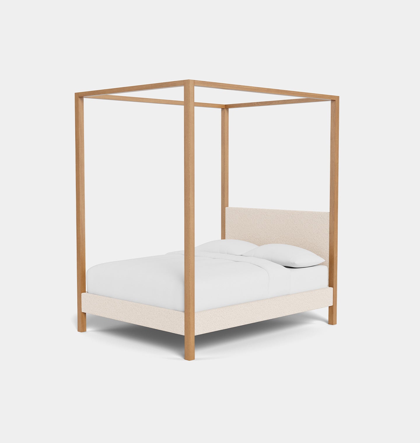 The Briyana Bed is a statement making canopy bed. The Briyana Bed is made from solid oak and constructed as a single frame canopy piece for added durability. Features an upholstered headboard, footboard, and side rails. With modern lines and a range of fabrics and finishes, the Briyana Bed is the versatile statement piece your bedroom has been waiting for. Featured in Natural Oak and Sand fabric.