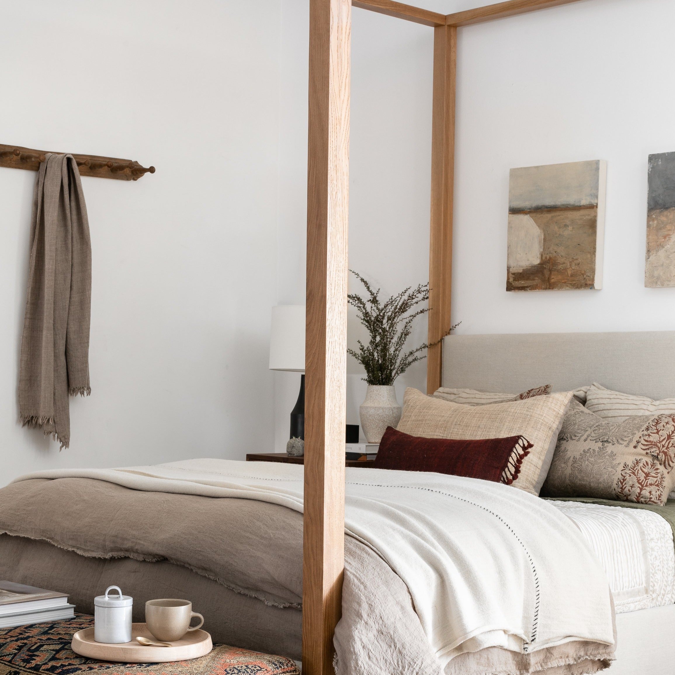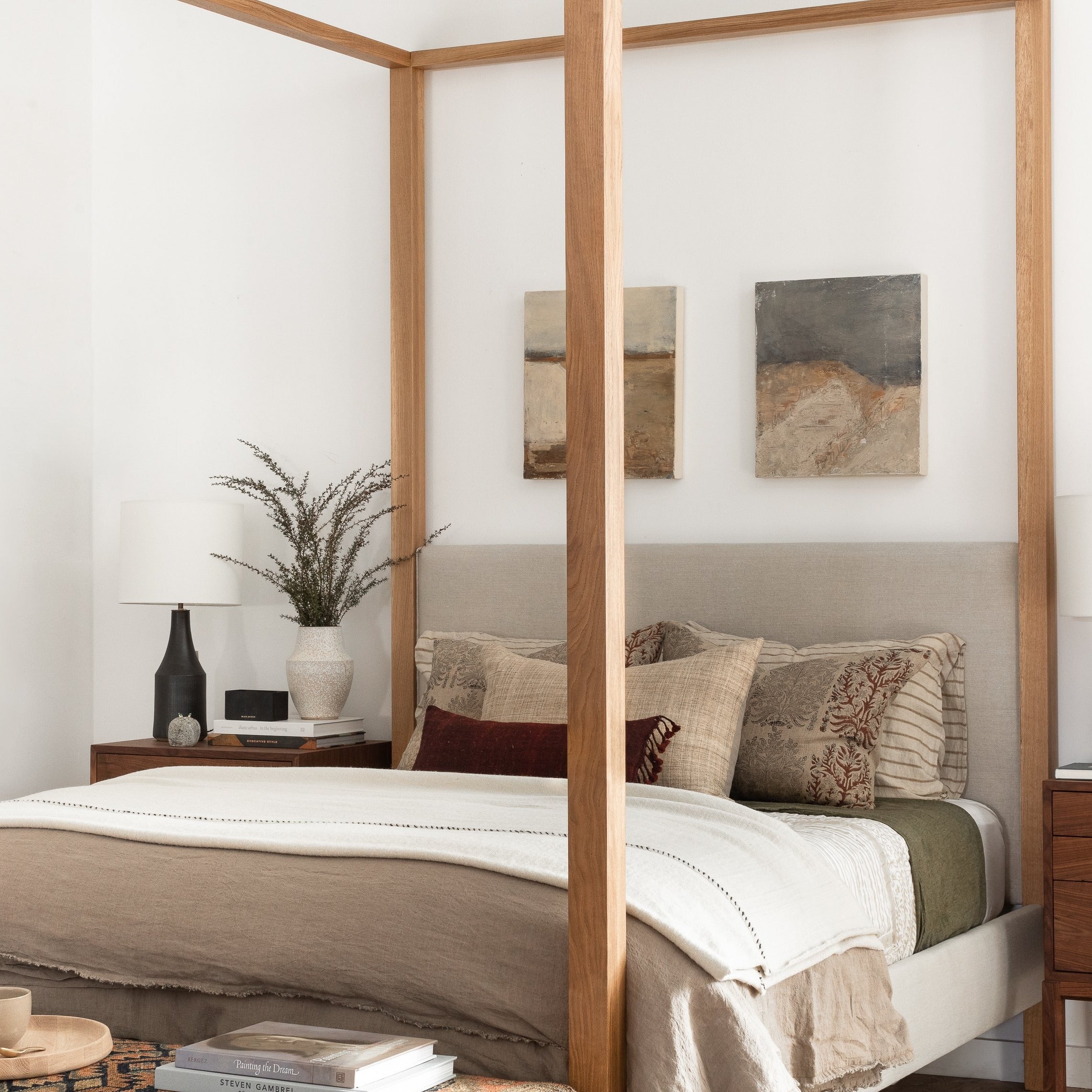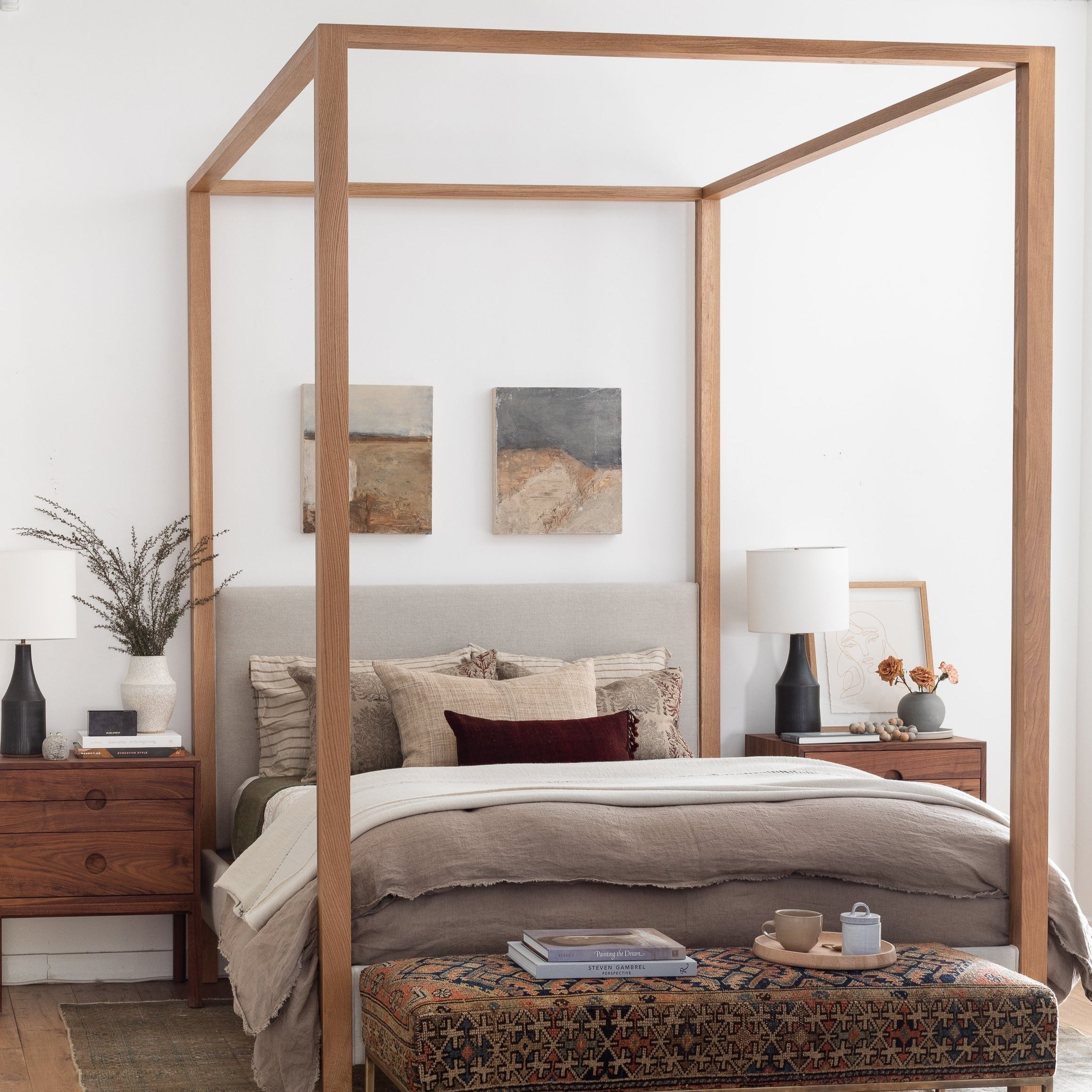 The Briyana Bed is a statement making canopy bed. The Briyana Bed is made from solid oak and constructed as a single frame canopy piece for added durability. Features an upholstered headboard, footboard, and side rails. With modern lines and a range of fabrics and finishes, the Briyana Bed is the versatile statement piece your bedroom has been waiting for. Featured in Natural Oak and Sand fabric.