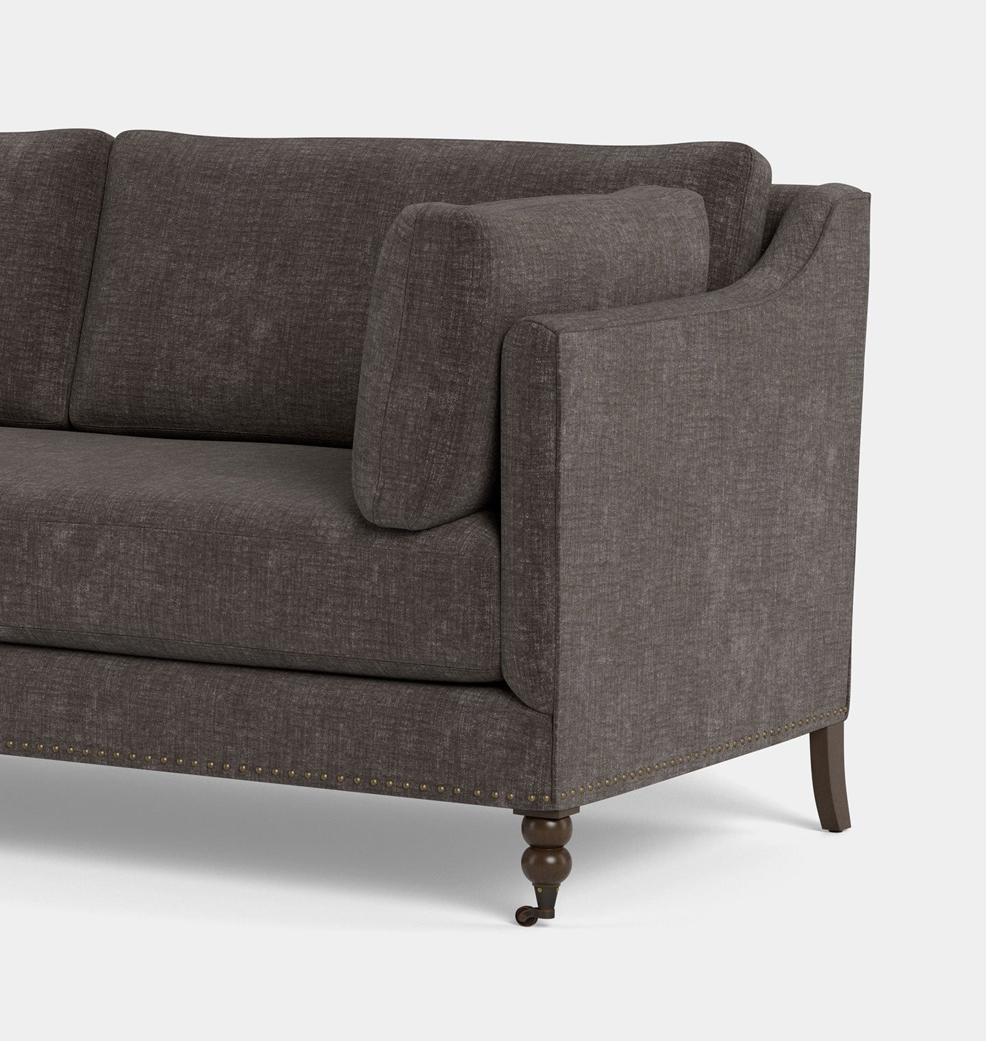 The Riviera Sofa is a traditional-style upholstered sofa with a single bench seat cushion. A structured frame offers support with additional arm cushions for comfort. The sofa sits on oak castor feet for an elevated look. The nailhead trim along the bottom of the sofa offers a sophisticated detail all design lovers will appreciate. Sit back, relax, and kick your feet up—comfort is key with a plush down-wrapped foam seat cushion. Featured in our Haze upholstery. Available without nailheads upon request, simply contact shoppe@shoppeamberinteriors.com.