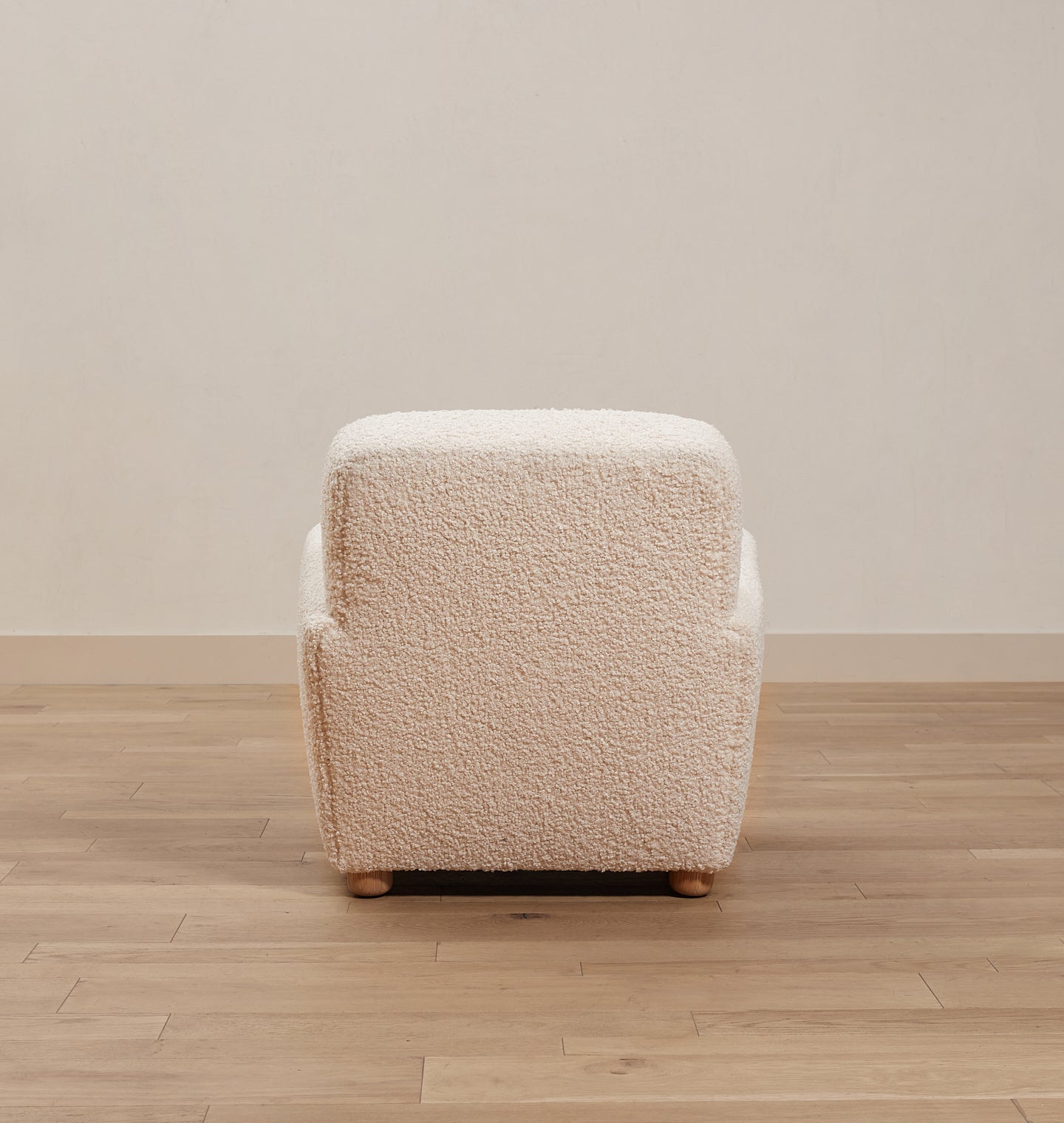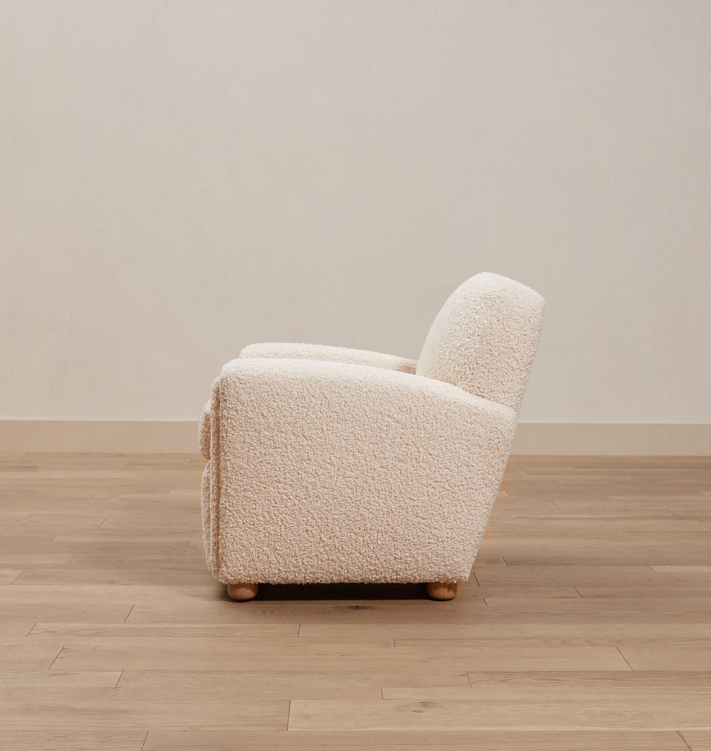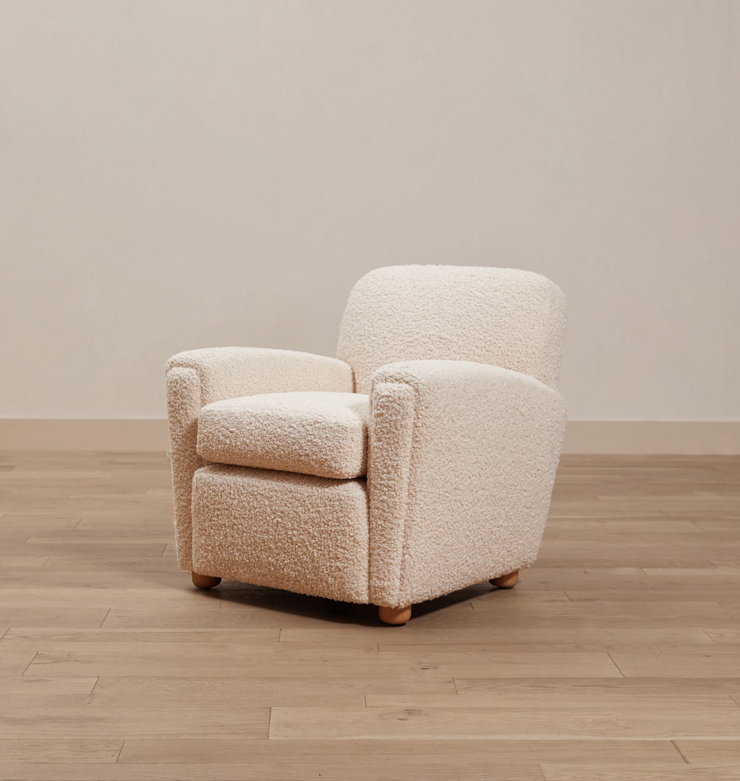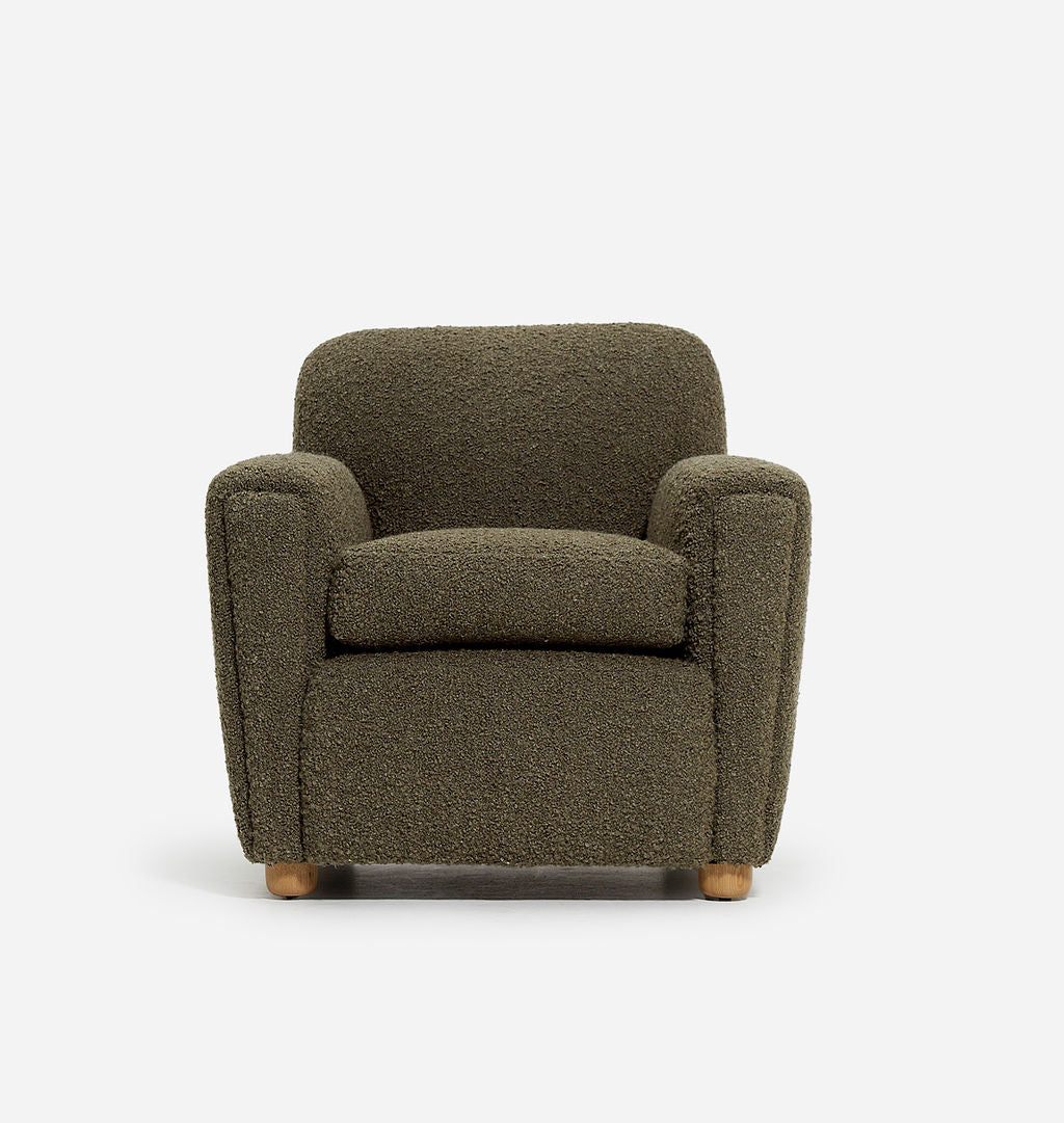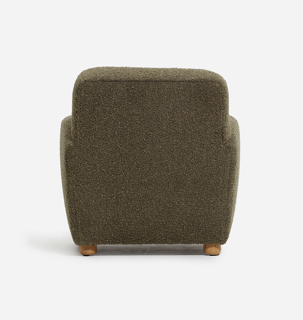 The Theo Armchair is our take on the classic club chair, with a petite footprint, reclined back, and curved arms that create shapely lines. This armchair is handmade with an extra plush down seat cushion for the ultimate in comfort. Featuring modern, round oak feet, you'll be cozied up in no time in comfort and style. Featured in Bone Boucle upholstery.