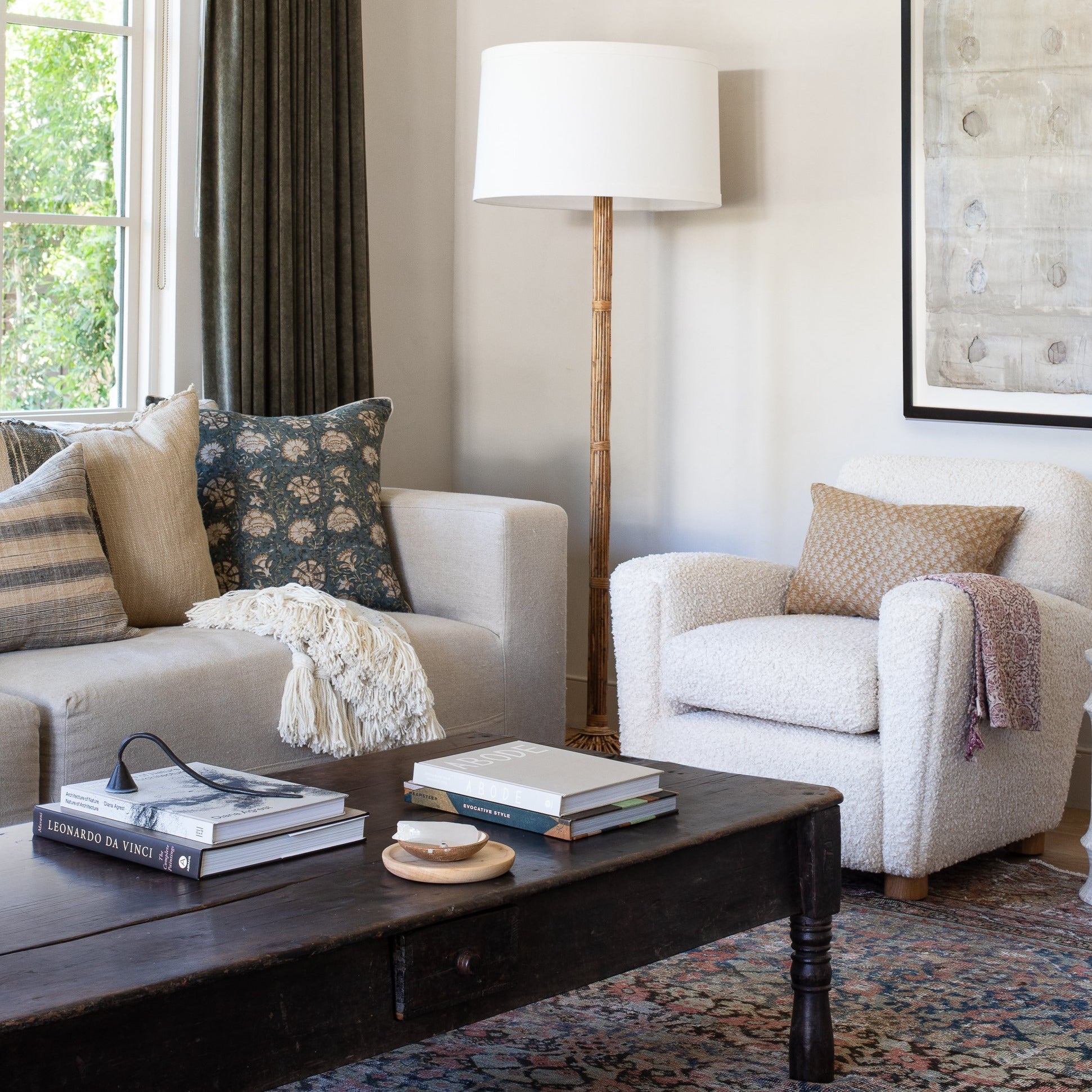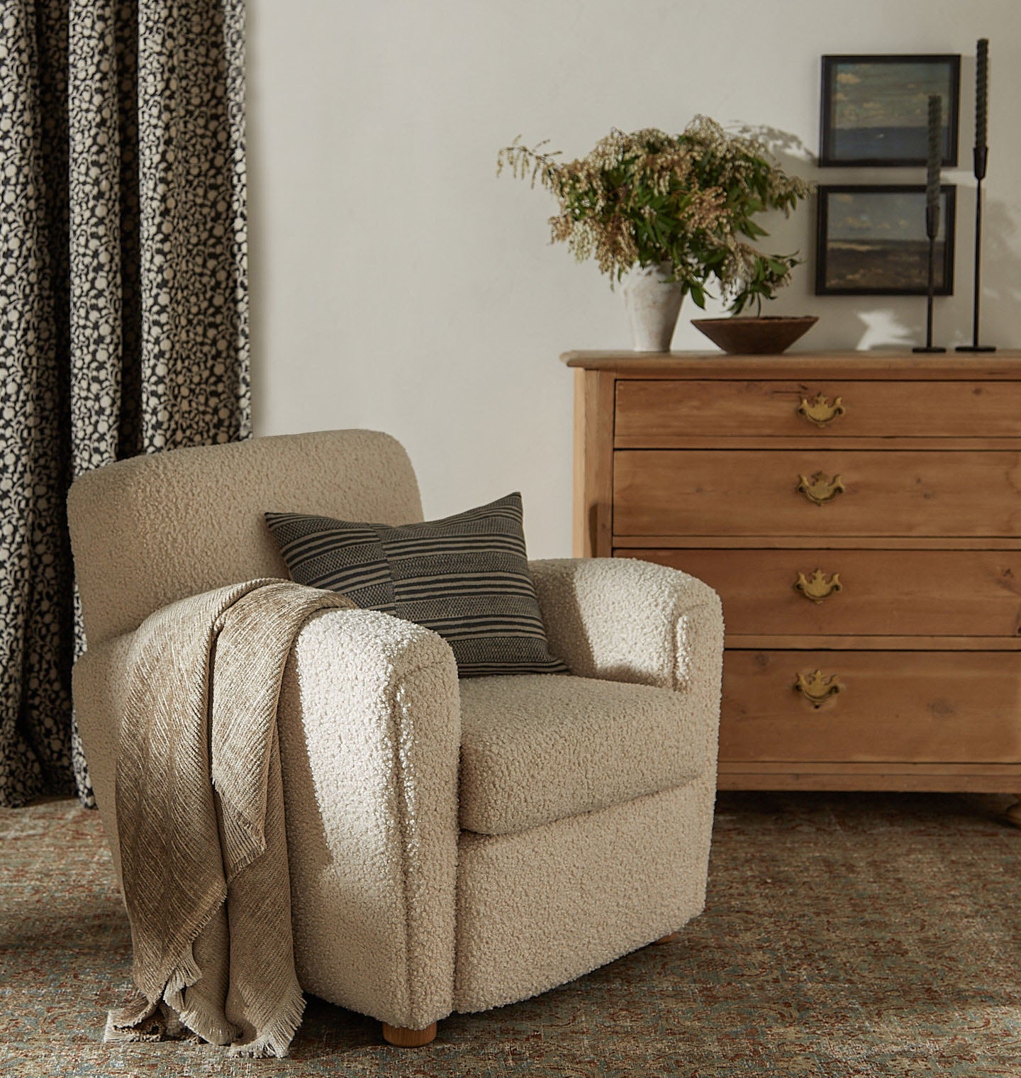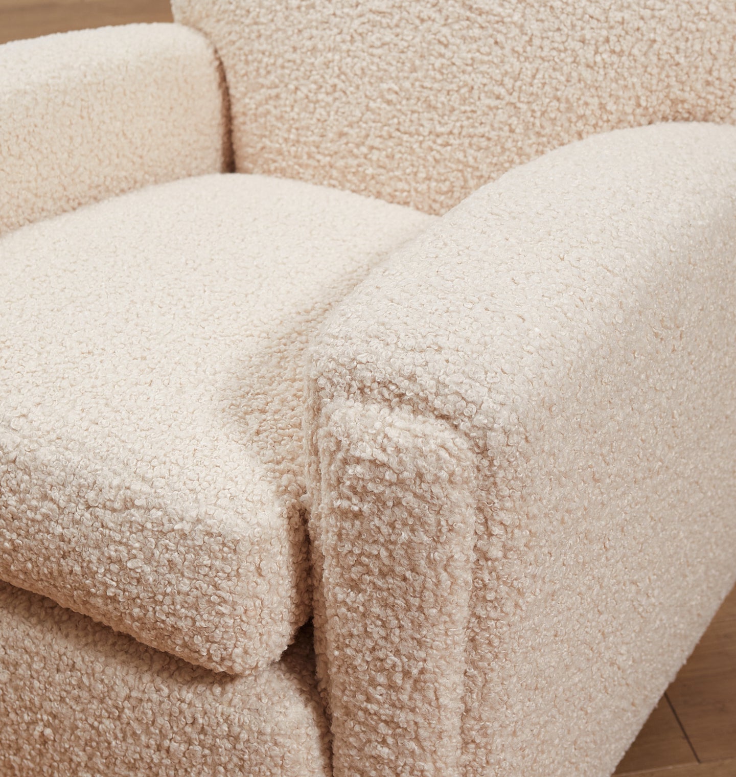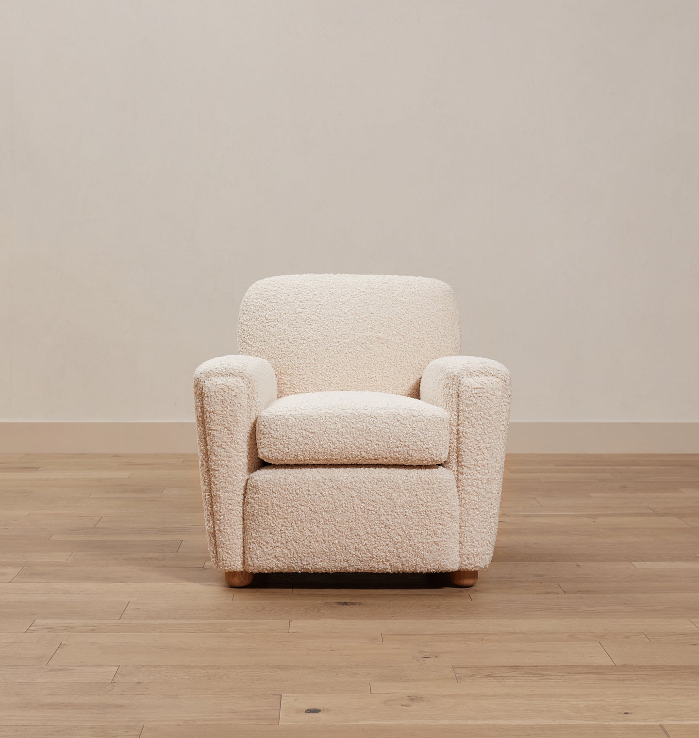 The Theo Armchair is our take on the classic club chair, with a petite footprint, reclined back, and curved arms that create shapely lines. This armchair is handmade with an extra plush down seat cushion for the ultimate in comfort. Featuring modern, round oak feet, you'll be cozied up in no time in comfort and style. Featured in Bone Boucle upholstery.